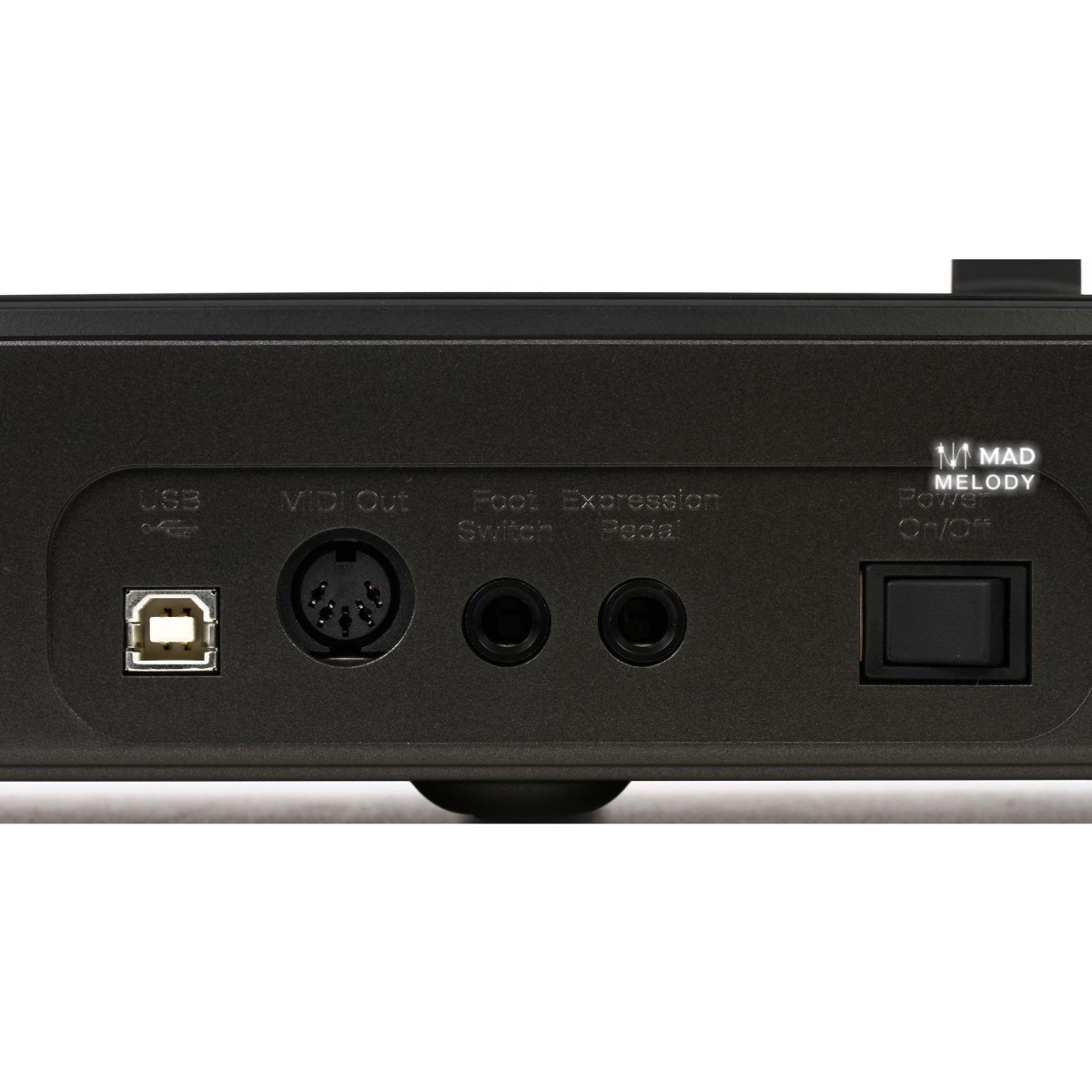 There's a USB port, a sustain pedal port, expression pedal jack, MIDI output, and an.